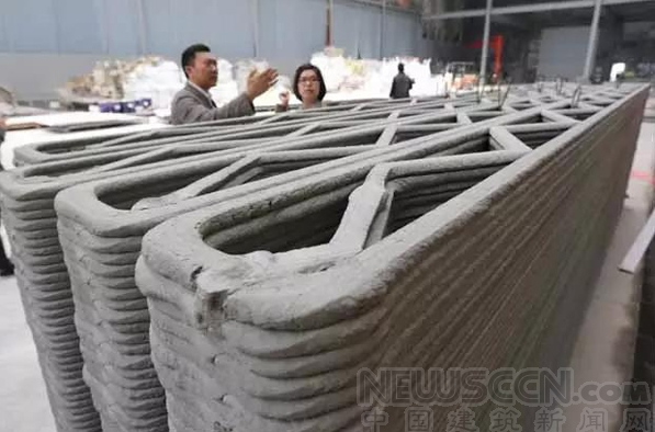 馬義和(左)展示他公司在上海建造的房屋的3D打印墻體。他的公司計(jì)劃一天建造十幢這樣的房屋。
